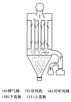 (1)過濾:含塵煙氣經(jīng)煙道進入進氣管,由上部進入進氣室,部分粗粒由慣性而落入灰斗,其余部分煙氣粉塵進入濾袋,經(jīng)內(nèi)表面過濾后,進入袋室,然后經(jīng)由通風槽、排氣閥、出氣管道由排風機排入大氣,該設備為上部進氣,負壓操作內(nèi)濾式玻纖袋除塵器。