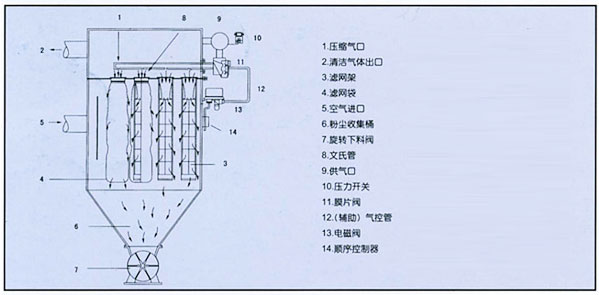 含塵氣體由進氣口進入灰斗(沒有灰斗的將直接進入袋室),然后經(jīng)由灰斗進入裝有濾袋的過濾室。粉塵附在濾袋的外表面,凈化后的氣體油濾袋進入上部箱體,再經(jīng)排風(fēng)管道,由風(fēng)機排到大氣