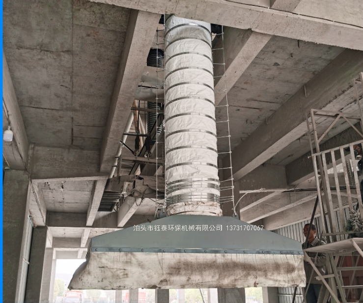 (2)水泥揚塵屬冷態(tài)粉塵空氣氣體,而冷態(tài)空氣再加上水泥粉塵的擴散混合,比重密度增大,根據(jù)水泥粉塵空氣的特殊性,要求吸塵罩設(shè)計時要有足夠大的負壓,要求吸塵罩口距離塵源800mm之間。