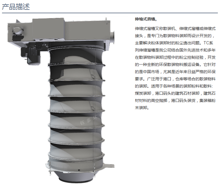 散裝物料伸縮溜筒主要特點:1.伸縮溜筒配套除塵器系統(tǒng),通過抽氣來收集裝料時產(chǎn)生的灰塵。2.自動控制卸料口接近卡車和火車車皮,從而節(jié)省時間,卸料口根據(jù)物料會迅速調(diào)整。3.外套筒用于控